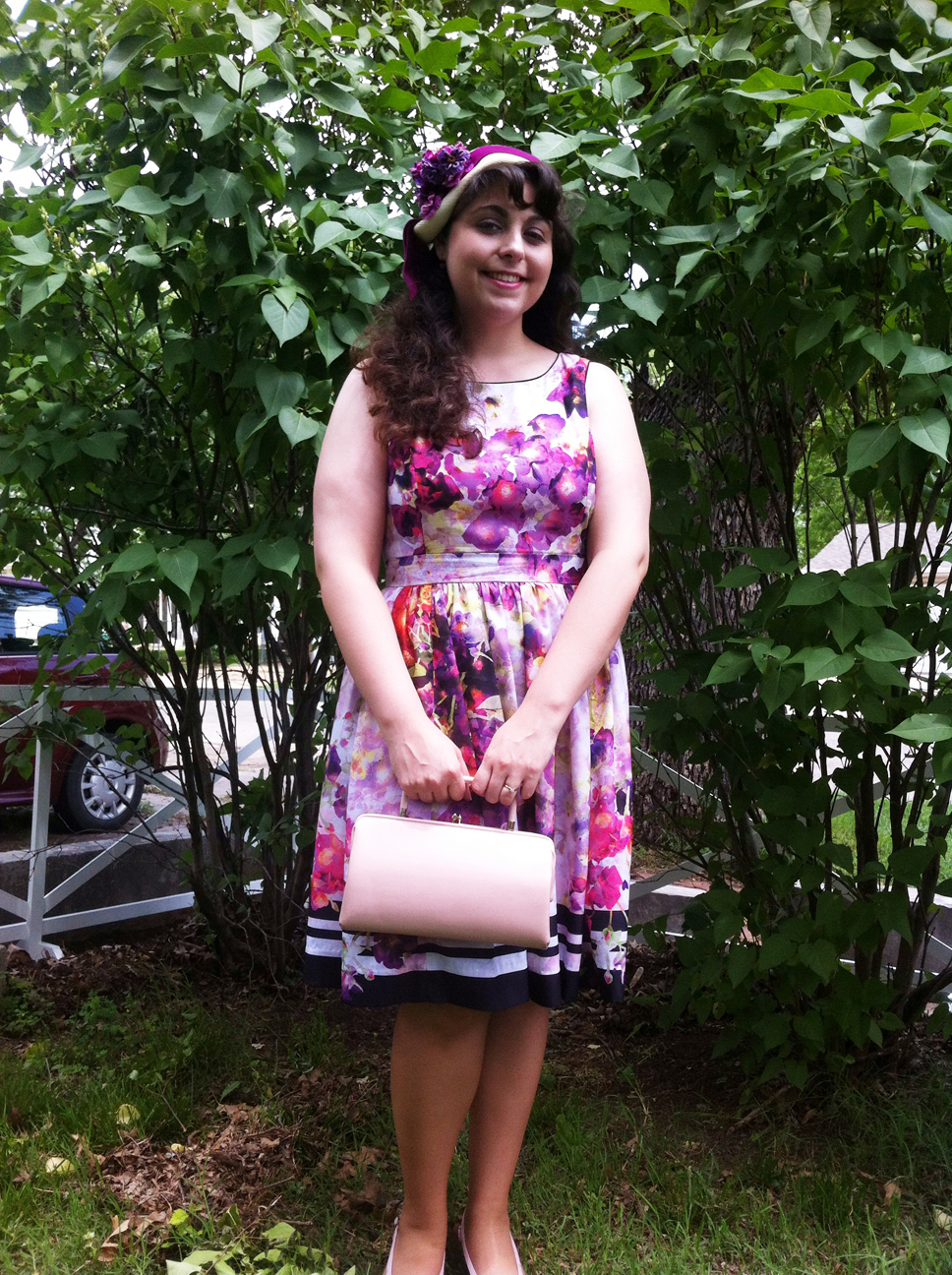 I paired the dress with one of my vintage purses and my absolute favorite vintage hat. I had bought the hat almost a year ago at a doll show for $23, which I thought was a little pricey, but worth it, because it is just darling. I hadn’t worn the hat, because I didn’t know what to wear it with, but when I brought this dress home, I knew it was a perfect match.