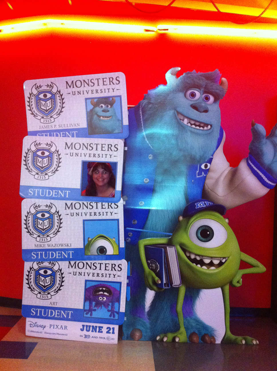 We ended the day going to the movies to see Star Trek in to the darkness (review to come). While at the theater I couldn’t resist stopping to get a picture of me in a Monster’s University Student ID card. Monster’s comes out next month and I’m eager to see it. Not only that but I can’t resist posing with silly cut outs any chance I get.