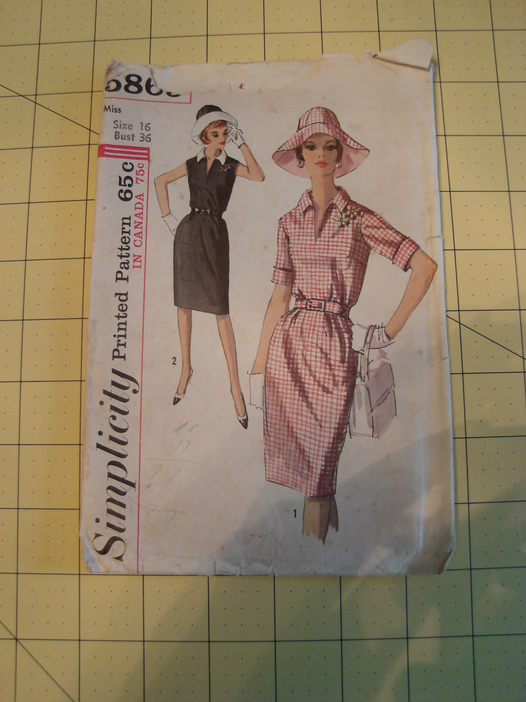 The second dress I decided to try my hand at, this summer was another vintage pattern by Simplicity. Pattern 5869, copyrighted 1965, is of a loosely fitted dress has elastic waistline casing, slit neck opening, collar, and back zipper closing. I choose to go with view 1 which included cuffed sleeves.