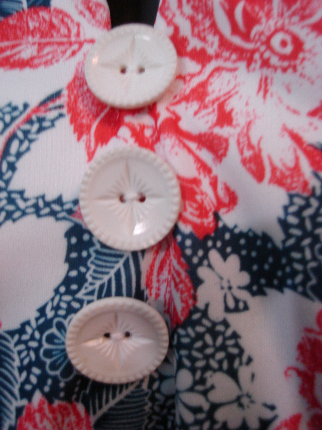 The material as I said I think it’s kind of a polyester/knit, so when I was making the “V” neck collar I accidentally clipped too close to the point on the “V” line and the fabric tore. I couldn’t just sew up a sort of hole as it was, and I couldn’t just leave it because I knew it would eventually expand. The solution I came up with was to sew some faux buttons on to the front right under the “V” line. The first button would be sewed as an anchor to stitch back the rip in the fabric, while the other two would be to accent the first.